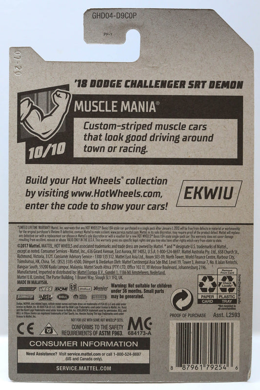 Hot Wheels '18 Dodge Challenger SRT Demon HW Muscle Mania GHD04 - Rare and HTF - Plus (+) a Bonus Hot Wheel