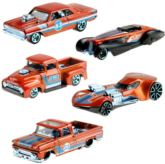 Hot Wheels Orange And Blue EMC 53rd Anniversary Models - GRR35-956A - Mix 1 Full Set of 5 Cars - Rare VHTF